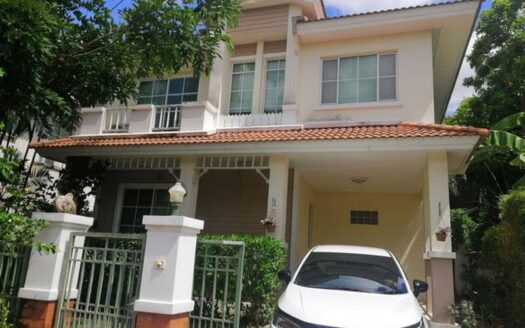 English version below. ขายหรือให้เช่า บ้านเดี่ยว 2 ชั้น หมู่บ้านบารเมษฐ์ เฉลิมพระเกียรติ 90 ตร.วา สวนสวย บรรยากาศสง