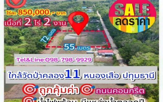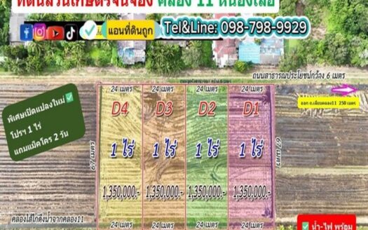 ที่ดินราคาถูกคลอง 11 หนองเสือ 1 ไร่ 1.35 ล้าน ไฟฟ้า-ประปาพร้อม ติดต่อ คุณแอน Tel.&Line: 098-798-9929 Line: inda