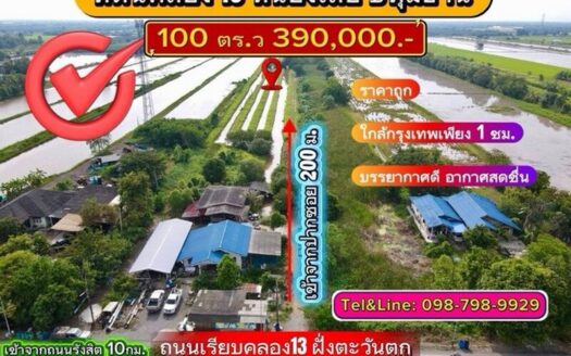 ที่ดินแปลงเล็ก ราคาถูก เหมาะทำบ้านสวน #ที่ดินคลอง13 อ.หนองเสือ จ.ปทุมธานี 100 ตารางวา 390,000 บาท มี 2 แปลง ติดต่อค