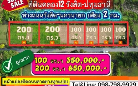 ด่วนที่สุด #ที่ดินคลอง12 รังสิต – ปทุมธานี (ห่างรังสิต-นครนายกเพียง 2 กม.) 100 ตร.ว 3.5 แสนบาท กว้าง 16.7 เมต