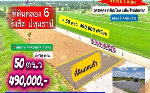 ด่วนๆ มี 1 แปลง 50 ตรว. 490,000 ฟรีโอน #ที่ดินคลอง6 (ถมแล้ว) คลองหลวง ปทุมธานี ติดถนนคอนกรีต ติดต่อคุณแอน โทร .098-