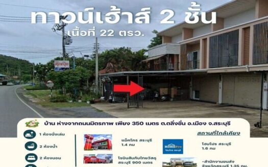 PZ1165 ขาย ทาวน์เฮาส์ 22 ตรว. ห่าง ถนนมิตรภาพ เพียง 300 เมตร ใกล้ โรบินสัน ไลฟ์สไตล์ สระบุรี เพียง 900 เมตร ตำบลตลิ