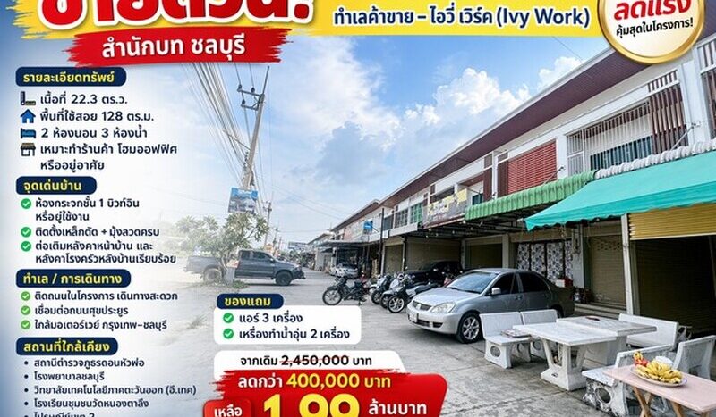 ขายด่วน! อาคารพาณิชย์ 2 ชั้น ติดถนน ไอวี่ เวิร์ค สำนักบก ชลบุรี