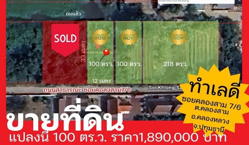 ขายที่ดินคลองสาม คลองหลวง ปทุมธานี พื้นที่ 100 ตร.ว