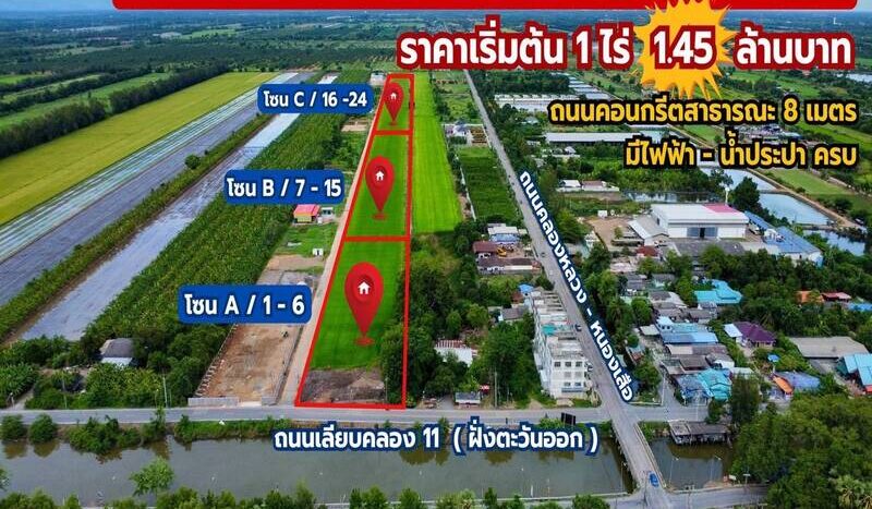 ขายที่ดินแปลงสวย ทำเลทอง คลอง 11 หนองเสือ จังหวัดปทุมธานี