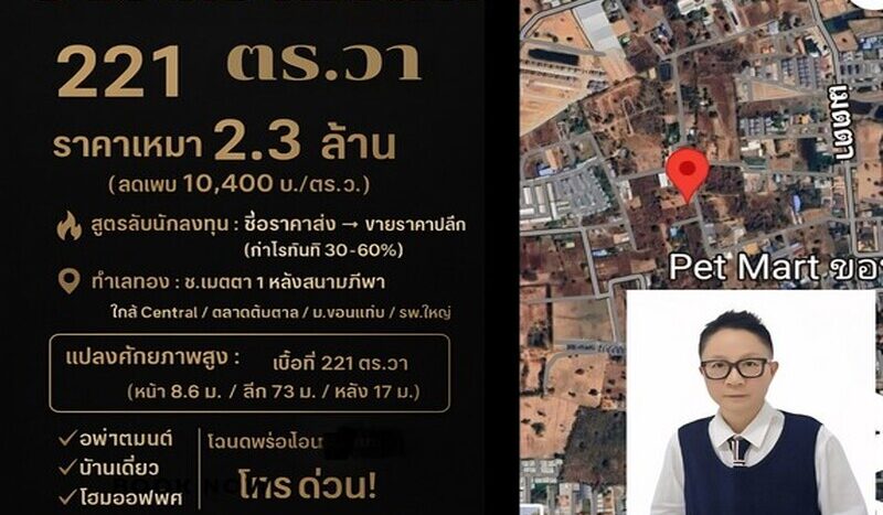 ที่ดิน 221 ตร.ว. กลางเมืองขอนแก่น! “กำไรทันที 30–60%” 2.3 ล้าน!