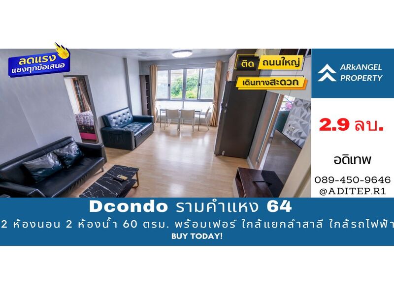 **ขายคอนโด 2 ห้องนอน ราคาถูก Dcondo รามคําแหง 64 ขนาด 60 ตรม. 2 ห้องนอน 2 ห้องน้ำ พร้อมเฟอร์นิเจอร์ ติดถนนใหญ่ ใกล้รถไฟฟ้า 2 สาย**
