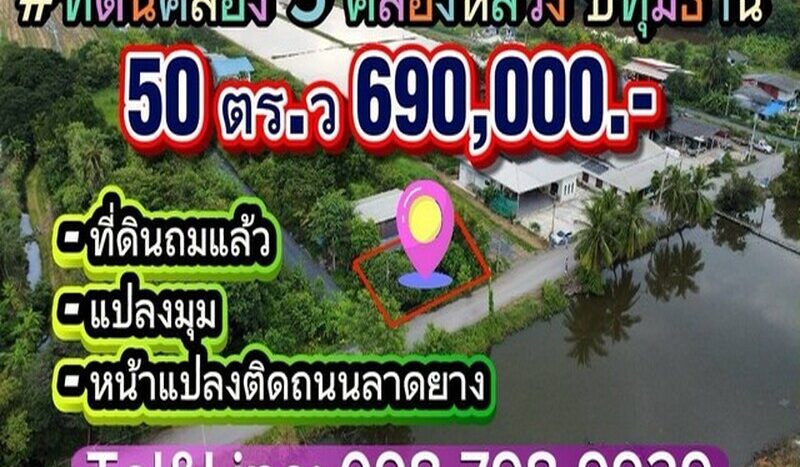 #ที่ดินคลอง 5 คลองหลวงปทุมธานี (ที่ดินถมแล้ว แปลงมุม หน้าแปลงติดถนนลาดยางเลียบคลอง5 ทำเลดีมาก) 50 ตร.ว 690,000.-