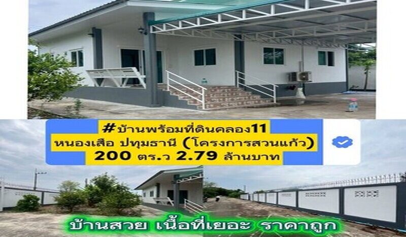 บ้านพร้อมที่ดินคลอง11หนองเสือ ปทุมธานี (โครงการสวนแก้ว) 200 ตร.ว 2.79 ล้านบาท