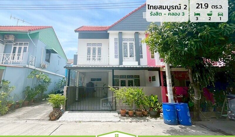 ขายทาวน์โฮม 2 ชั้น หมู่บ้านไทยสมบูรณ์ 2 รังสิต-คลอง 3 : Thai Somboon 2 Khlong Sam การเดินทางสะดวกสบาย สามารถเข้าออกได้ทั้ง 2 เส้นทาง ทั้ง ถนนรังสิต-นครนายก และถนนคลองหลวง เนื้อที่ 21.9 ตร.ว. ขายเพียง 1,990,000 ล้านบาท