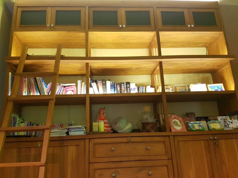 ห้องรับแขกชั้นล่าง ตกแต่งด้วย ตู้โชว์ไม้สัก และเคาน์เตอร์ไม้สัก อันงดงามยิ่ง ด้วยความประณีต และ ความเหมาะสม กับเทรนสมัยใหม่